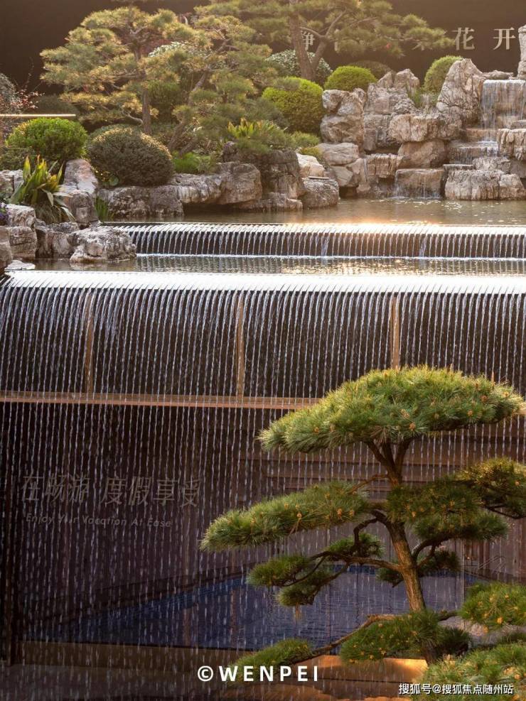 五棵精挑细选的黑松从溪涧中生长向上,山石造景的工法让水变得曲折,经过两重叠水,飞流直下,冲击出悦耳的白噪音和一幅李唐笔触下现代版的清溪渔隐图。