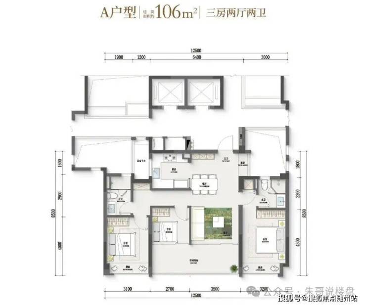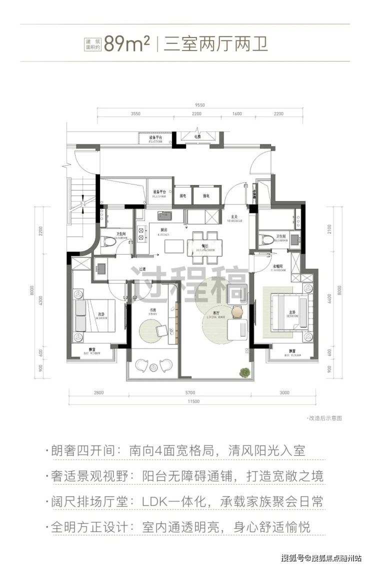 主力户型:建面约89㎡四开间朝南三房,超越常规小户格局,采光、通透性极佳。
