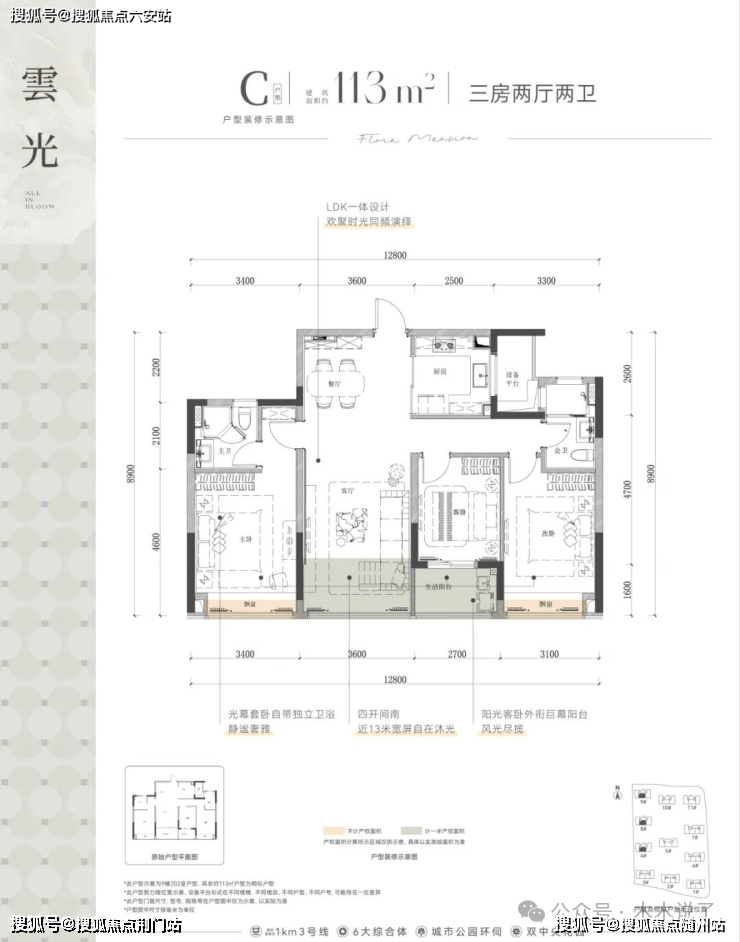 其次是建面约113㎡的三房两厅两卫户型,四开间朝南,拥有封闭式阳台,南向采光充足,使得整体空间更加宽敞明亮。
