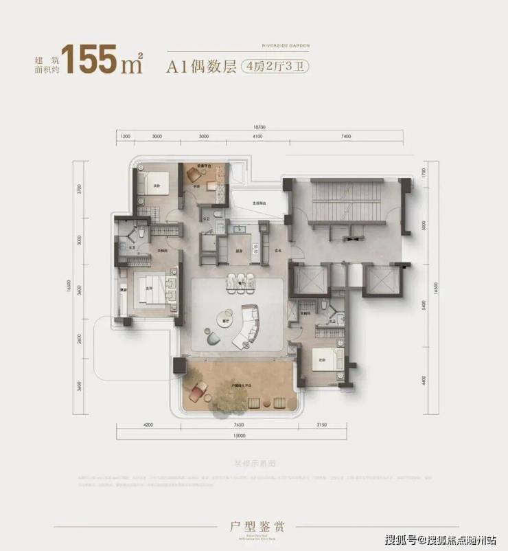建面约155㎡(A1偶数层),以超越尺度的空间想象,承载媲美200㎡的生活格局。一梯一户,独立玄关,约7.65米南向大宽厅,与餐厨一体贯通。