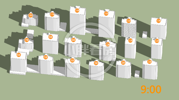 夏季:由于楼栋建筑角度为西南偏转和夏季太阳角度问题,楼栋上午处于阴影中,日照略有缺失。14#中低层受遮挡。就具体遮挡时间而言,14#主要在下午受15#遮挡。
