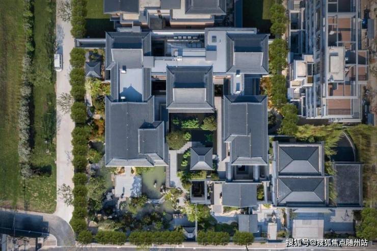 从空中鸟瞰整个地块,一字横向排开的建筑群落充分与不远处的城市湖山形成呼应关系,主入口被布置在次级道路上以保证官邸大宅的私密与宁静,沿亚太路一侧则对城市喧嚣主干道形成退让,行车落客处低调中透着一股世家屋檐的显赫气派。