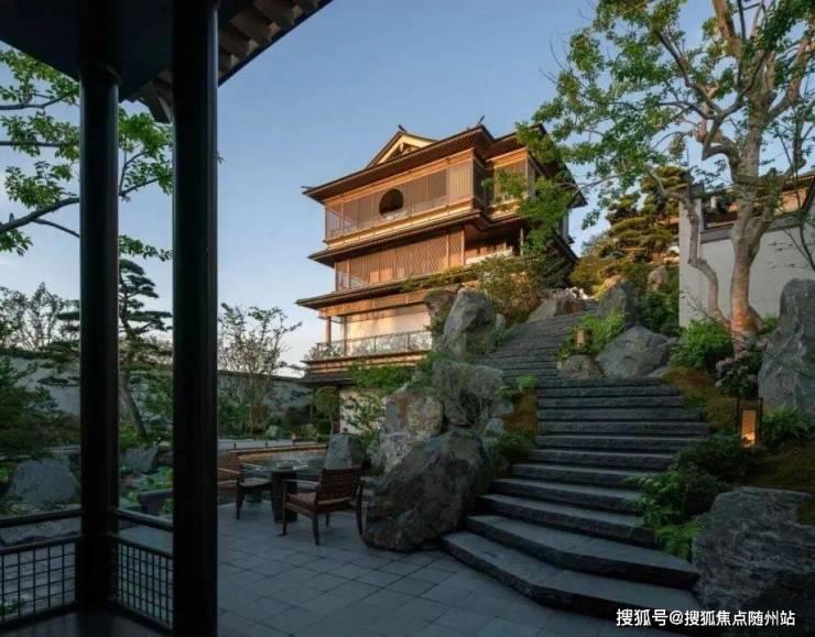 宋代郭熙在论山水画时就提到“但可行、可望,不如可居、可游之为得。”22#“泉香”总建筑面积6676.87㎡,其中庭院占地面积达2672.62㎡,俯瞰呈“L”形布局,全园结构精密得宜,自西南至东北依次设置理水、叠山,磅礴建筑绕院聚合,形成曲径通幽的行进序列。
