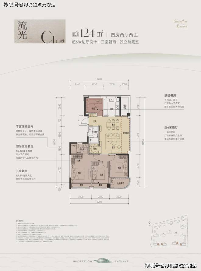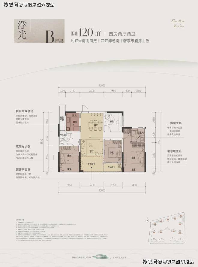 这款户型堪称四开间朝南的“流量王者”,南向面宽约13米,双联阳台+双飘窗设计,视野和采光优秀;套房主卧、双阳光次卧,颇有大平层的气势。
