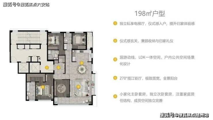 观江设计:160㎡户型设6.3米巨幕江景边厅,198㎡楼王户型通过南向阳台和东向飘窗实现270°全景观江视野。
