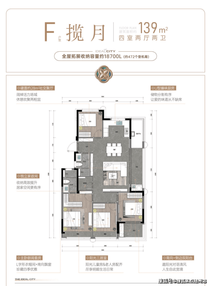 建面约107㎡户型,则把重点放在舒适度上。阔绰方厅+双联阳台,通风赏景至佳,还有U型厨房,三面操作空间,动线流畅好用;套房式主卧更配置了步入式衣帽间,独立卫浴设计,保证了主人家的隐私和仪式感。