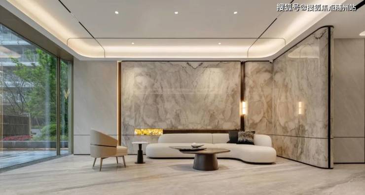 云河颂将湾流G800的优雅之弧,贯穿地下、首层、标准层等各个细节处,以圆弧造型吊顶,与墙面石材、木饰面弧形线条,电梯弧形门头交相辉映,另外奢石背景墙,加上金属造型镶嵌玛瑙石,搭配云河颂logo,点睛之笔镌刻专属精神图腾。