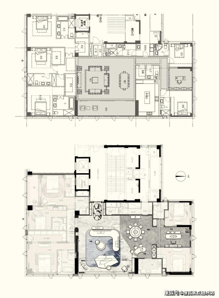 约300㎡“观湖”,谢柯打造;另一款是更宽舒的约412㎡“行云”,出自邱德光。尤其是约412㎡“行云”,无论玄关处雪花白、劳伦黑金、金世纪的大胆拼花,瓦楞式的波浪形电视背景墙,还是吸睛的普拉达绿石材吧台,全屋随处可见出色审美和奢华材质的完美结合。