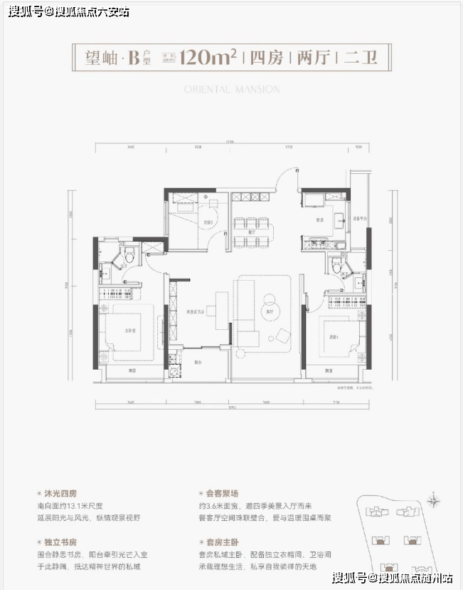 建面约120平米户型,四居室户型,同面积段罕见的约13.1米南向超大面宽,四间卧室面宽均超3米,南向主卧与次卧分列客厅两侧,私密性极佳;客餐厅与阳台无缝衔接,空间开阔大气,采光更佳;主卧采用套房设计,舒适度全面升级。