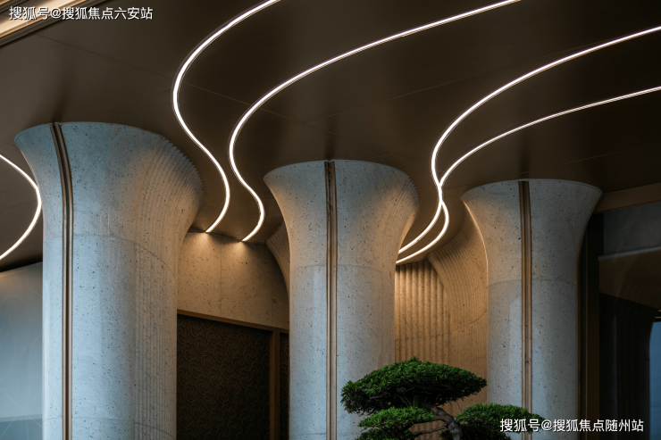 鸣澜里的建筑立面设计颇具匠心,四面铝板、造型格栅与大面玻璃幕墙的精妙设计,辅以深灰基座与鎏金窗框的点缀,构筑出沉稳大气的风格,赋予建筑轻盈漂浮的视觉感受。通过打磨建筑单体的圆角弧度,不仅丰富了层次感,更营造出通透开阔的空间意境,引领未来审美新风尚。
