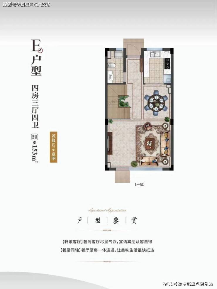 整体四房三厅四卫动静分离的设计;U型厨房连接餐客厅,组成了开阔大气的全功能型首层空间。