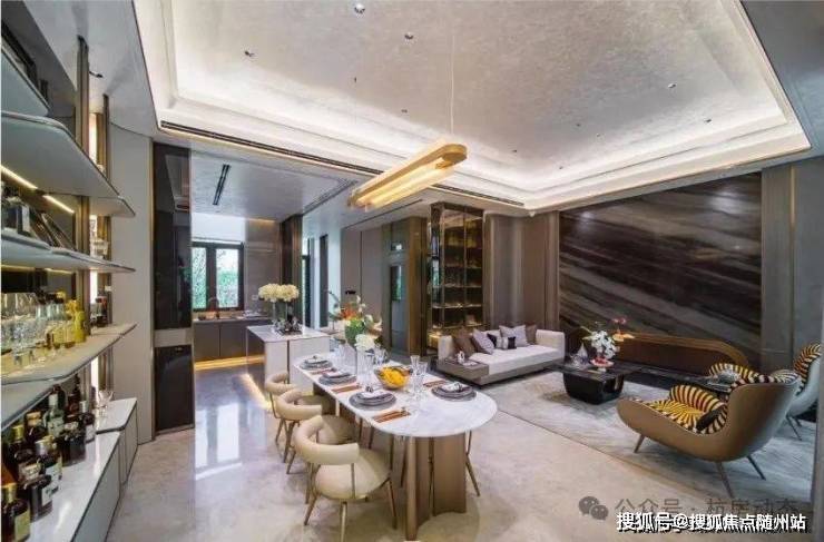 客餐厅采用一体化设计,通过石材、影木、皮革、金属、玻璃等不同材质在光影下的交织,形成张弛有度的现代轻奢多元的场景体验,内敛优雅,充盈着浓郁的都市质感。