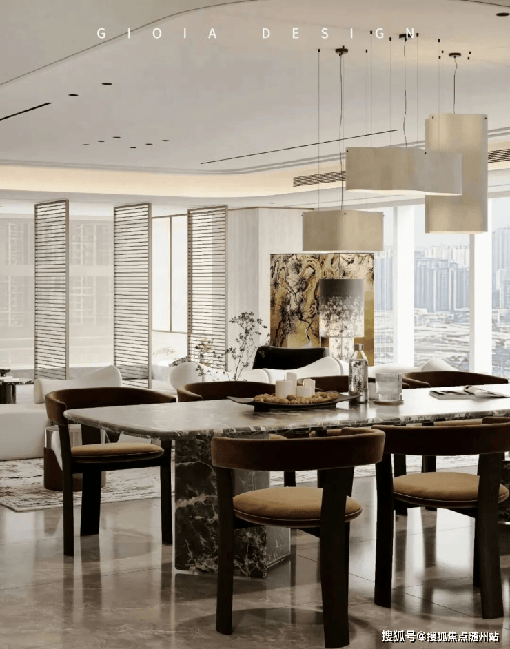 最后是精奢于心的优雅空间,例如由琚宾设计的杭州首个宋韵作品「SONG370」,提取经典名画《西湖全景图》中的丹青意蕴,运用风景开阖、空间对比等传统设计手法,从青玉横幅背景墙到金缕编织墙面,从自然奢石到苔藓微山水,千百次挑选材质和精工打磨,为杭州带来一处奥体之上的江南庭院。