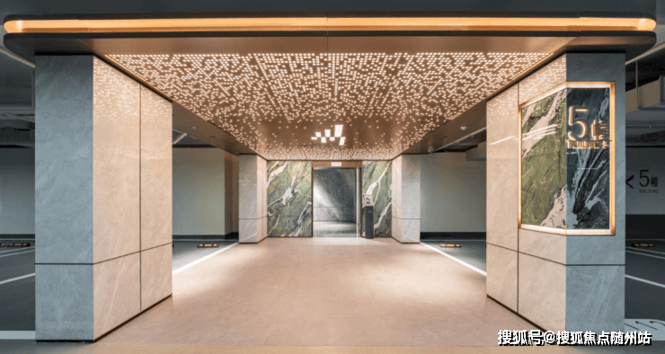 从小区入户处采用灯光设计、美学装置,到地下门厅也设置了香槟金吊顶、仿玉石陶板,高品质材质打造的氛围和质感,让业主每次归家都像是进入星级度假酒店;