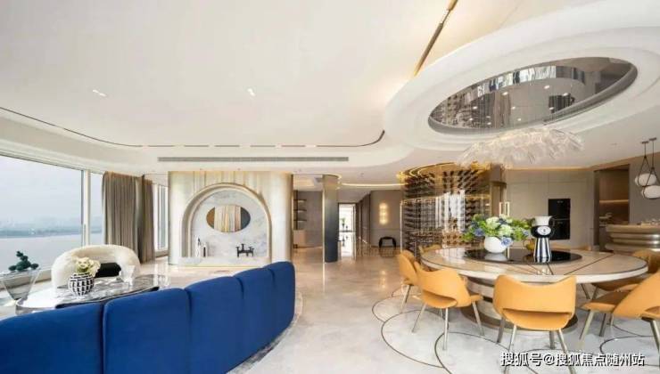 江景艺术:270°环幕视野,19米超大面宽客厅,U形双转角落地窗设计,室内以钱塘江为灵感,选用进口奢石(如芬迪白大理石)。