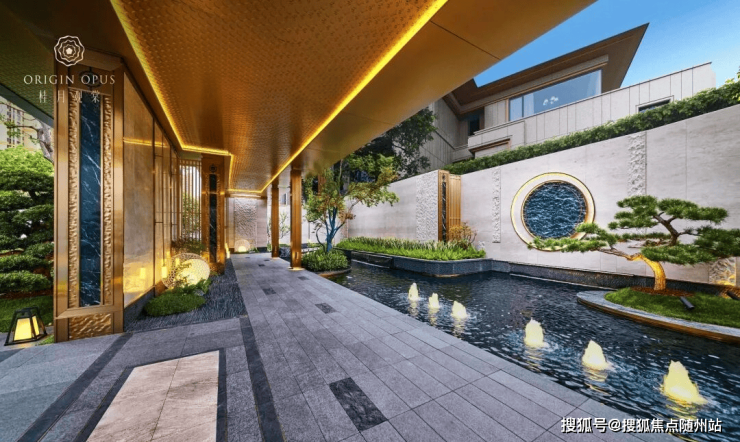 入户两侧水景清泉涌动,婉转迂回,一座精致的宋风美学馆展示在眼前。透过门框衬映出满月景墙,甄选名贵奢石,在虚实掩映间延续着东方诗意山水的写意画卷。