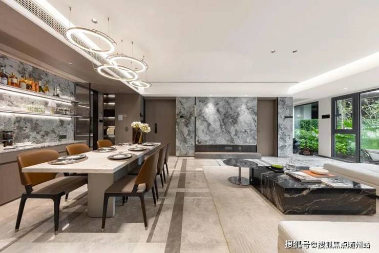 而在与城市接触的社区边界,璞拾闻澜则以消融隐退的方式,将社区隐于都市繁华之中,社区规划主动地进行红线退让,在开放与围合的姿态中,自成一座都市中的自然之屿。社区入口,璞拾闻澜还汲取了曼谷四季酒店的灵感,充满仪式感的宝门廊结合奢石元素及超尺度灯具的演绎,延伸社区的都市度假意境。