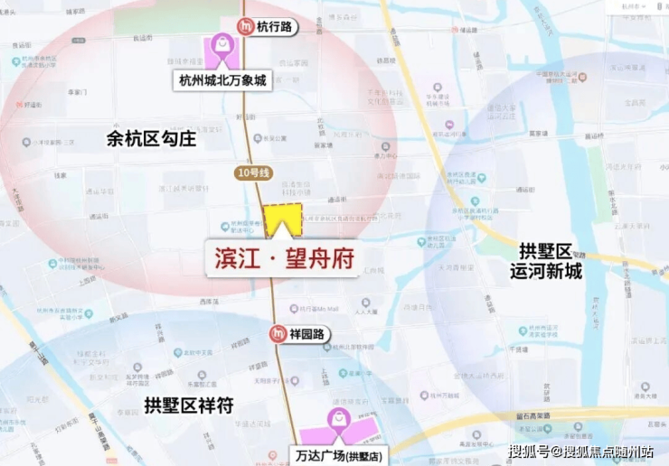 滨江望舟府位于余杭区勾庄板块,步行约550米就能走到拱墅区区界。项目坐落在杭行路东侧,被万家名城、瑷颐湾这样的成熟小区包围,所以周边的居住氛围已经相当浓厚,不是那种需要从头开始建设的“拓荒盘”。