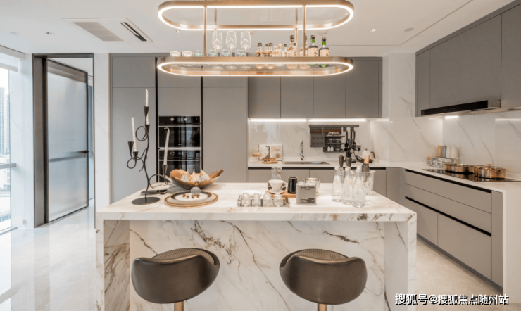 厨房配备德格六件套、杜邦可丽耐岛台;卫浴采用高仪境雨系列、唯宝智能马桶;全屋植入罗格朗智能灯光系统,业主可自定义场景模式。