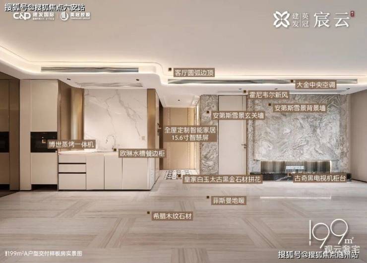 奢华和纯净是进入室内的第一印象。安第斯雪景奢石从玄关铺陈到电视背景,希腊木纹石材通铺地面,墙面是闪亮的影木。这是四房三卫南北双阳台的户型,除了精致的硬装之外,体贴入微的生活前置考虑是他最大的价值。