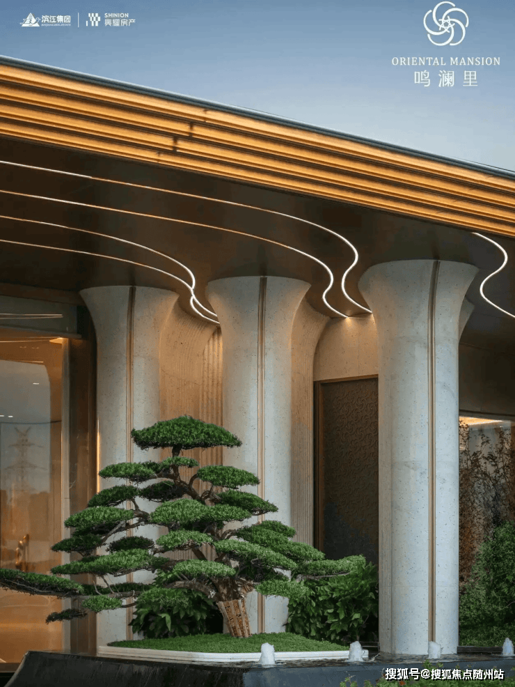 门前两棵罗汉松;园区内的中央园林围绕新型蓝宝石戏水池打造,营造澜韵迎宾、松鸣涧语、鸣泉叠韵、鸣芳拾趣、鸣香径幽等九境空间。
