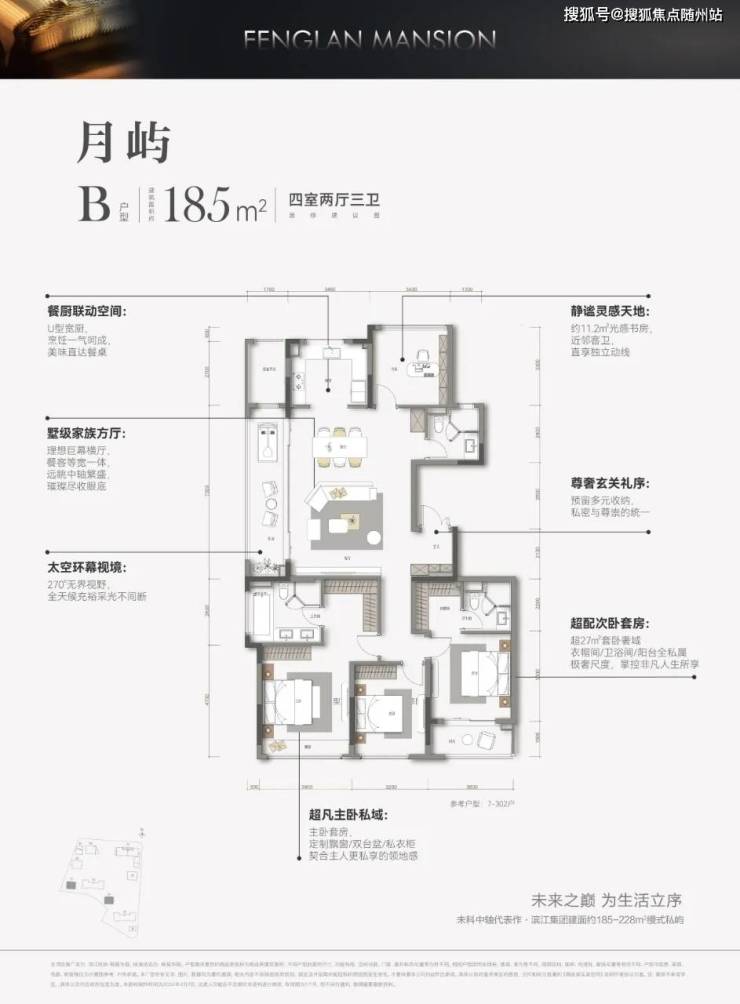 纯豪宅的空间、尺度:户型建筑面积为约四房185㎡、187㎡,五房223㎡、228㎡,纯改善。约185㎡做四房,这是豪宅的尺度。