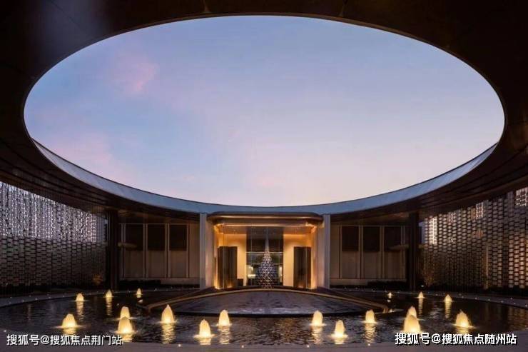 从主入口迈入第二重景观,可以看到一大片圆形水景。是直径约30米,总面积约660㎡的空间,以“天圆地方”为设计理念,池底铺满幻影蓝石材,中间点缀一个“水滴”造型雕塑,将水引入大区景观中,打造“四水归堂”的礼序空间。