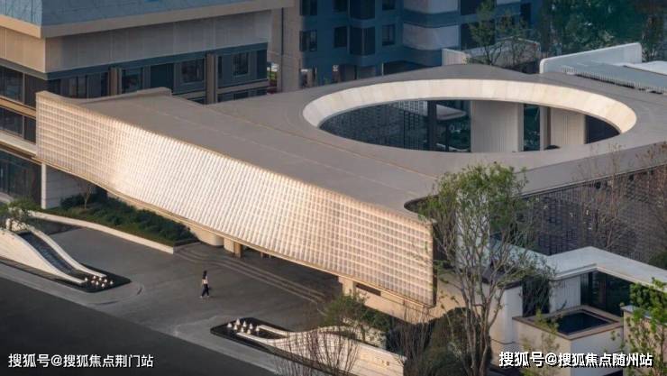 首先,楼盘的主入口是宽约46米、高约9米的阔绰大门,顶部是由约2280片波浪形的水晶玻璃瓦拼合而成的大屋檐,灵感来自“京杭大运河博物馆”。