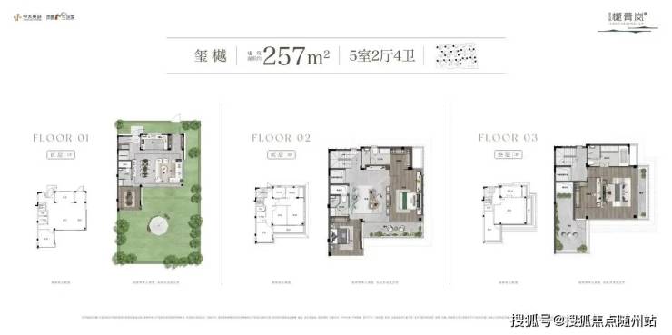 空间布局:建面约207㎡户型南北双花园,露台面积近40㎡,顶层可改造星空茶室;257㎡户型五卧朝南,前庭后院私密性拉满