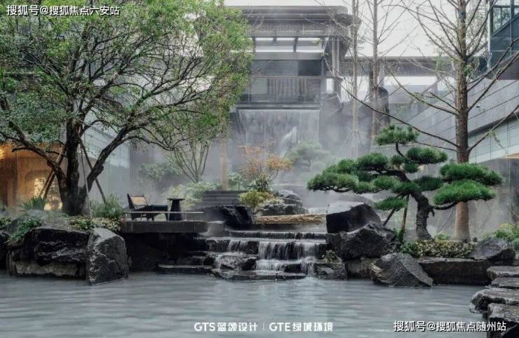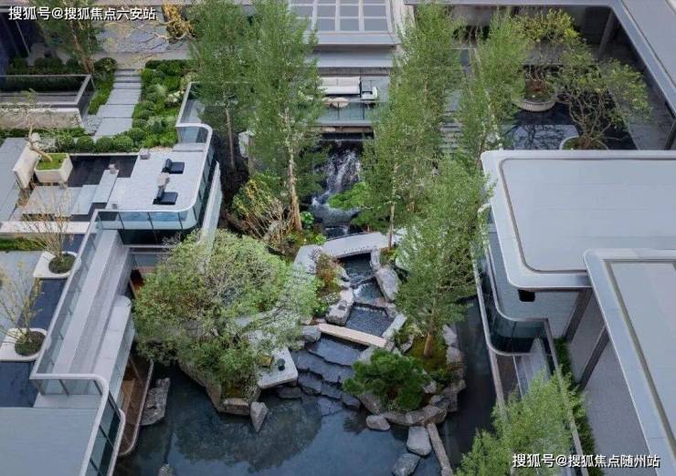 绿城·馥香园的山水庭院设计,巧妙融合了山、水、石、树等元素,呈现出一种独特的视觉美感,仿佛将人们带入了一幅生动的青绿山水画卷之中。其中,流水跌瀑的设计尤为引人注目,老皮石模拟的天然崖壁与山石错落叠放,水瀑落下时飞珠溅起,营造出一种“断山疑画障,悬溜泻鸣琴”的诗意氛围。