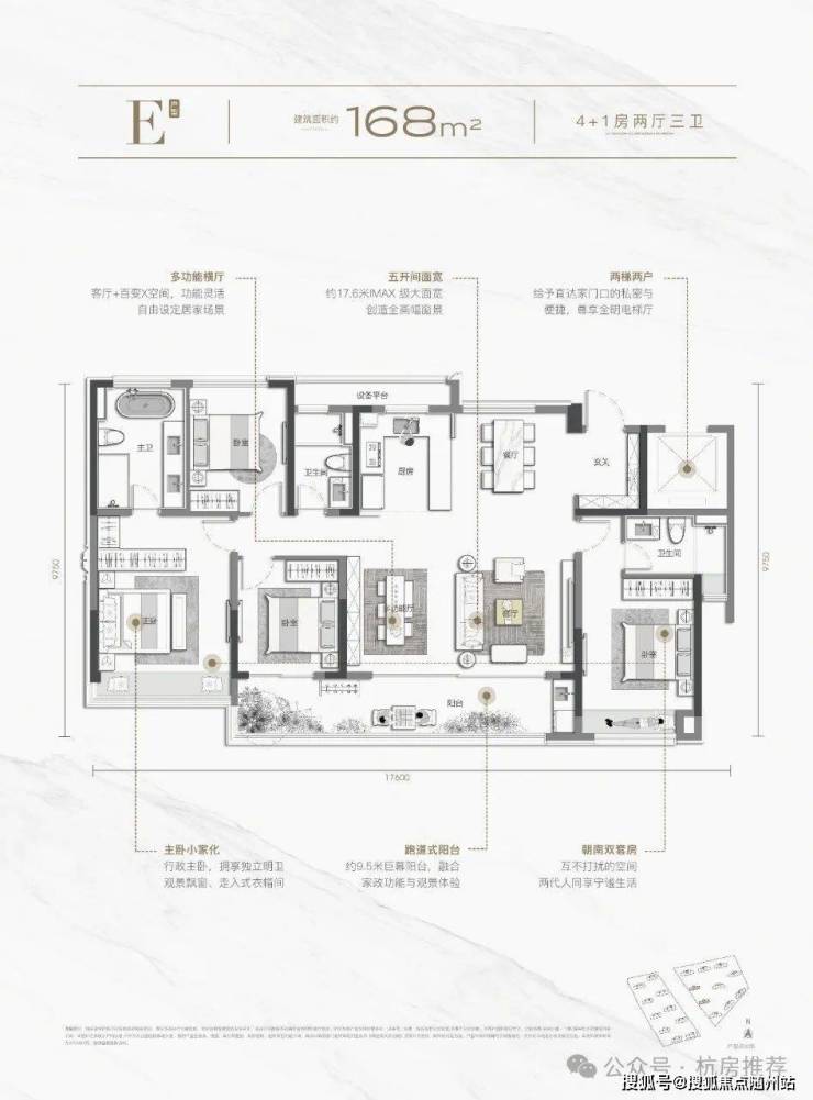 ✦难得巨幕尺度户型》最大约17.6米IMAX级面宽、最多五开间,创造全画幅窗景》双阳台+270°环幕边厅,打造室内采光景观新体验》LDKB一体化设计,无界家庭公区,增进家人间的互动》S墙创新设计,实现内嵌式收纳,室内更平整简洁》主卧小家化,复合更多功能场景,自成独立生活系统》半开放式厨房,可开合移门+互动岛台,增加厨房的社交性