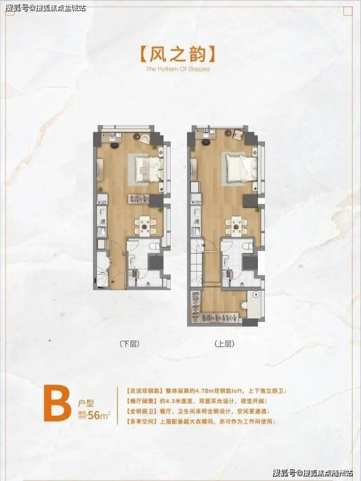 稀缺产品设计:主力50-56㎡ LOFT公寓,层高4.78米,采用双钥匙+分层入户结构(买一层享两层),可自住+出租或分租两户
