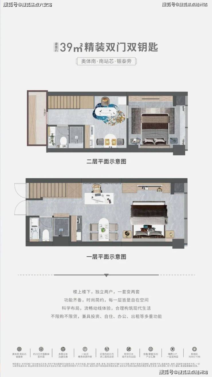 精装双门双钥匙,层高约4.5米,买一层享两层,小面积低总价、不限购不限贷,兼具投资、自住、办公、出租、养老多重功能,准现房收益可期。