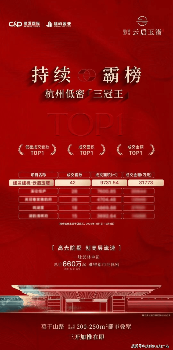 云启玉渚,这座踞守莫干山路豪宅带的当红院墅,在一个多月内接连三开,首开即罄,顺势火爆加推,以低密之姿创高层流速,持续霸榜杭州低密“三冠王”(榜单信息来源于袋鼠汇,2025年11月1日-12月8日),印证了城西唯一在售纯低密的稀缺性与超配产品力。