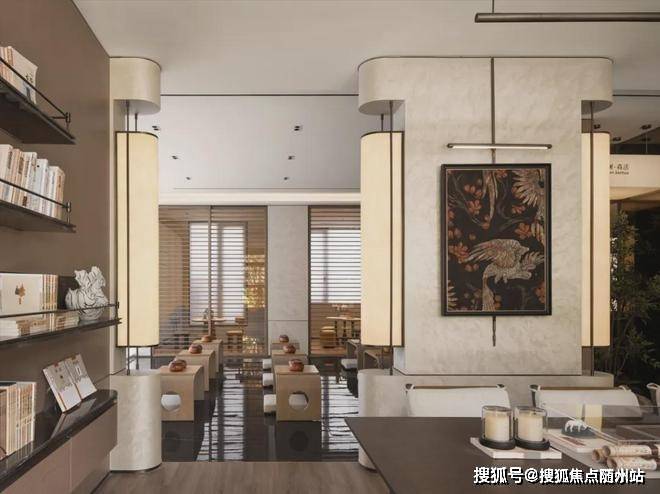 门堂『云栖门』,宽度超60米,顶部采用单檐平屋顶,简约利落;入口处的金属格栅屏风,以及堂内由山石、叠水、植被组成的景墙,让半隐半露中展现东方的审美情趣。