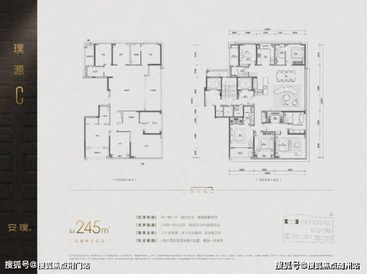 建面约245㎡的边厅户型,则在主卧留出了270°转角窗,在晨昏之间捕捉窗外美景与光影流动。