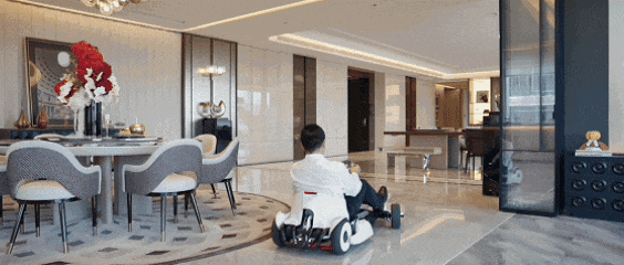 在门口喊一声,回音会在家里“走”一个来回。宠孩子的话,买辆卡丁车在家里开也不是不可以。