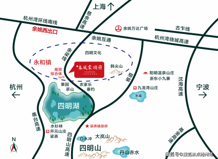 春风棠颂府的“生活半径”,因近揽古镇梁弄而更显丰富。项目距梁弄镇仅约3公里,开车10分钟可达: