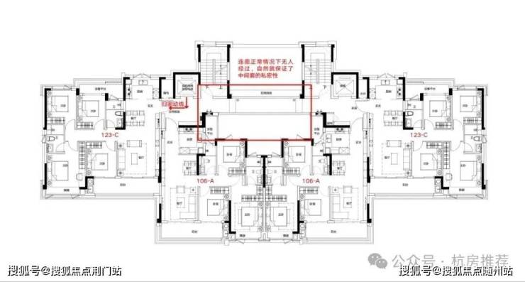 首先这个户型解决了中间套的隐私问题,如上图所示,两个边套回家都不需要经过连廊,所以保证了中间套的私密性。