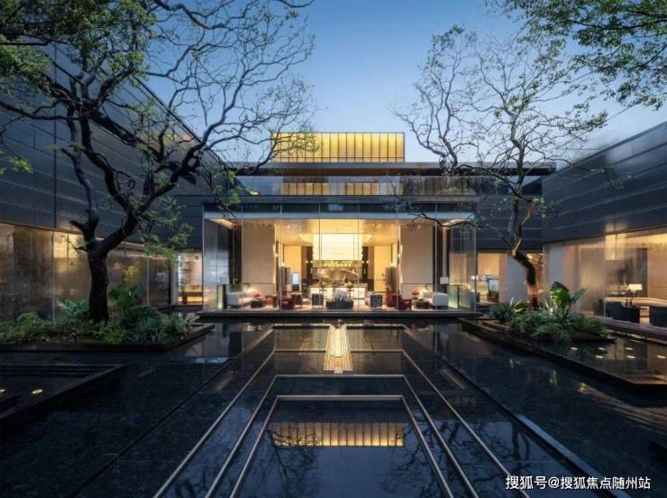保利明湖金茂府是把回廊、大堂和大门串联在一起,形成一整个「地面大堂系统」;又把地面和下沉式庭院嵌套在一起,共享同一片乌桕林的好风景。
