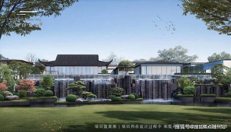 项目依山势分为六大组团:绿屿、香洲、明月、清风、凌云以及安和,整个项目均为中式低密住宅,绿屿组团以苏式园林为造园蓝本,而其余组团则均为宋代中式风格。宋代中式合院,南向采用落地玻璃幕墙,视野采光通风效果绝佳,坡屋顶设计,线条简洁大气,整体造型流畅。