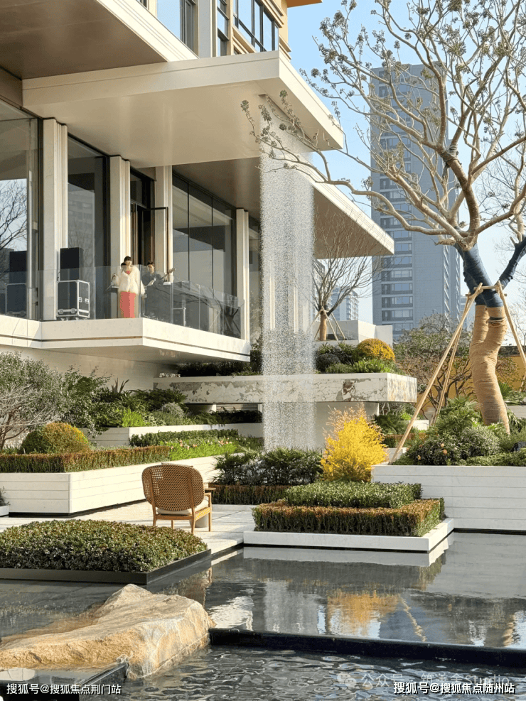 设计师在这里奢侈地造了一个宽约150米、纵深约36米的超级水院。奢石、叠水、层层绿植与雕塑高低错落,最特别的是,一道叠瀑直接从建筑立面上倾泻而下,仿佛建筑在与自然对话。