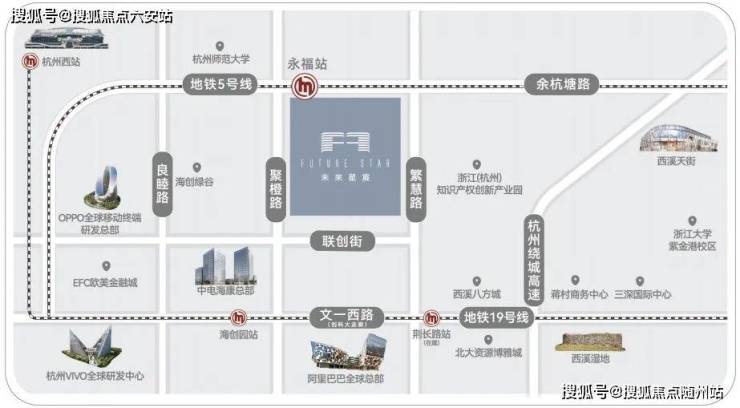 地理位置:坐落于杭州未来科技城核心区域,紧邻地铁5号线永福站D/E/F出入口,实现地铁上盖的无缝对接。
