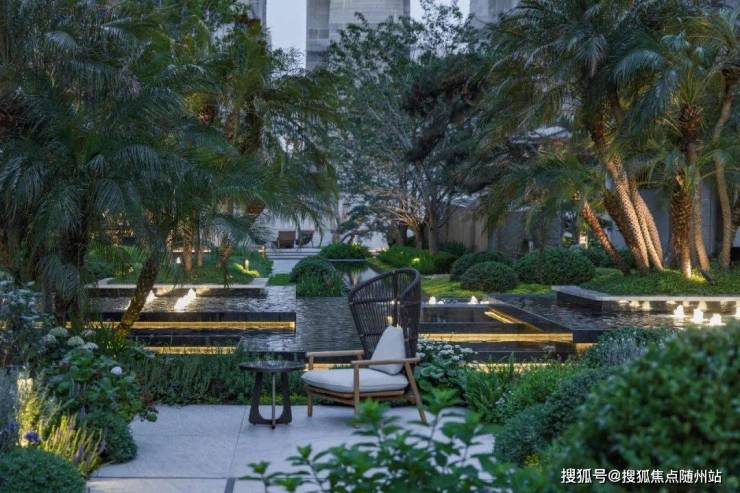 庭院中种植了多杆丛生的针葵榈,比单杆树形更昂贵,而且更讨微风的喜欢。明湖逸庐在庭院里用微高差打造出了层层叠叠的水景,嵌入了一个与水面齐平的下沉式会客厅卡座,夜幕降临时,池底的灯光与四周氛围灯会为你带来更温暖的包裹感。水景的出水口都是精细的梳齿状,这样的出水口,庭院中有约1600个。临水而坐,潺潺水声在耳身边环绕,很有松弛的度假感。