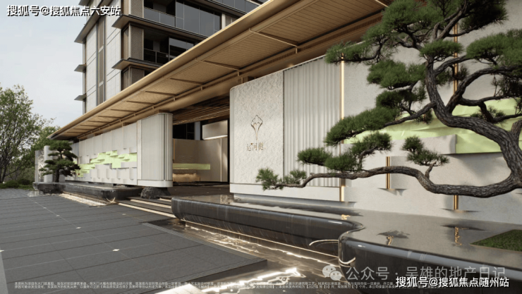 运河樾的园林感,几乎从门头就开始了:贯穿的水系、奢石景墙之上的玉石飘带,都像是把运河的水给引了过来,再配上金色的坡屋顶,很有江南院落的雅贵气质。