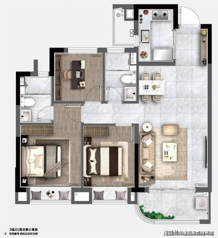 让人眼前一亮的,是它超广角度的弧形阳台。坦白来讲,这样的设计我只在少数千万级大平层中见到过。