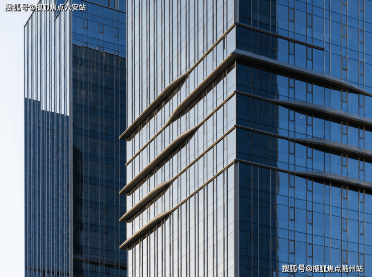 高层建筑约26-27层,立面以大面积淡蓝色玻璃幕墙与金属铝板线条勾勒,极具现代雕塑美感与地标气势。