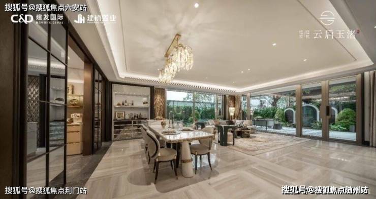 以建面约290㎡排屋样板房为例,玄关处黑白拼花地面,构成几何秩序的序厅深色皮革墙面与古铜金属勾勒出沉稳质感;玉琮纹样、良渚图腾等文化符号,被巧妙转译为现代装饰细节。整个空间在“海派风情”“东方意境”之间取得精妙平衡,不张扬,却见格调。