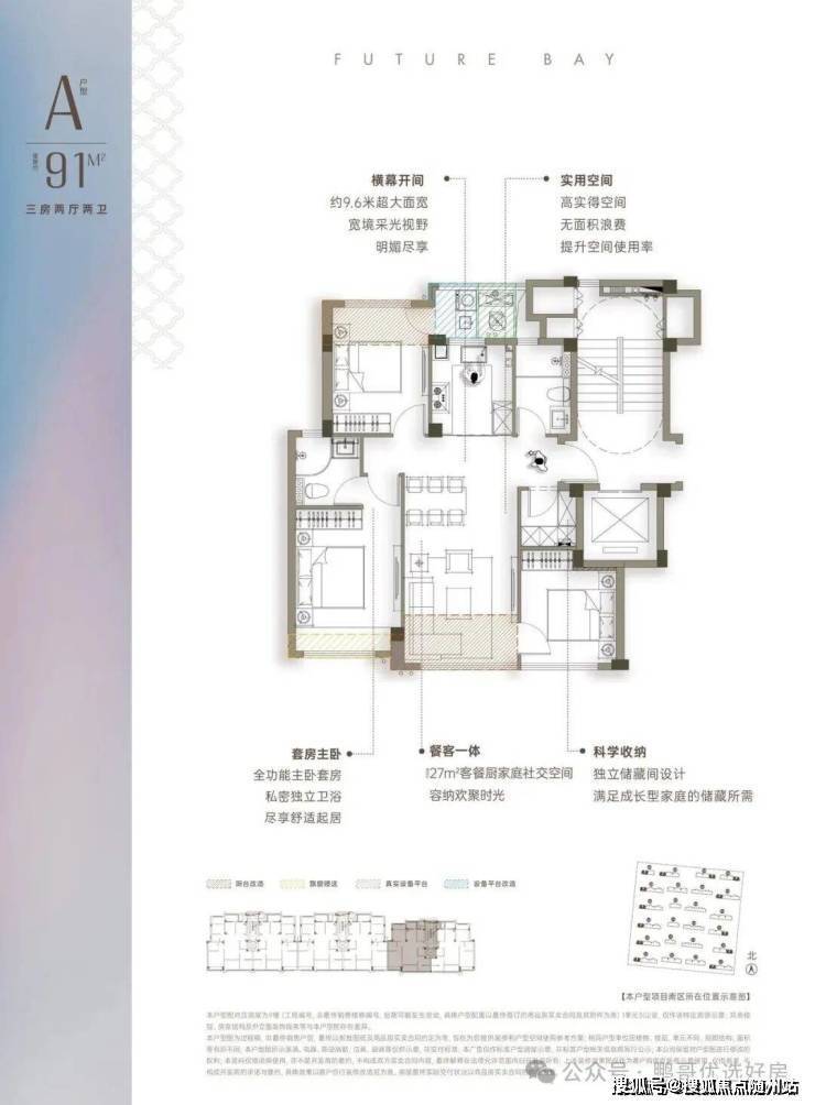 ◎横幕开间:约27㎡客餐厅,约9.6m超大面宽,宽境采光视野◎U型厨房设计:操作动线流畅,可容纳多人协作◎真三房+真南北通透:北侧无消防连廊,实现纯粹南北对流。三开间朝南,最小卧室面积近9㎡,所有卧室面宽均达3米以上。