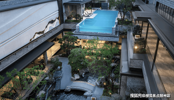 “青崖悬玉”悬挑泳池采用创新的无边际设计,水流仿佛直接汇入姚江;“曲涧鸣珮”下沉庭院以“十八学士”茶花为主题,营造出深山幽谷的意境。